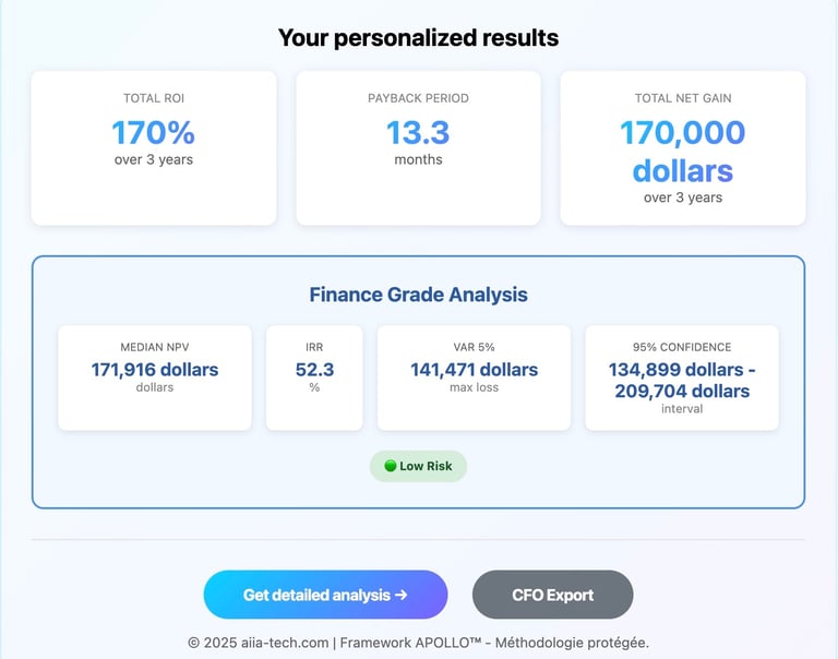Our calculator is the only solution designed to precisely simulate the ROI of your AI projects, adapted to your industry, company size, workflows, and budget.