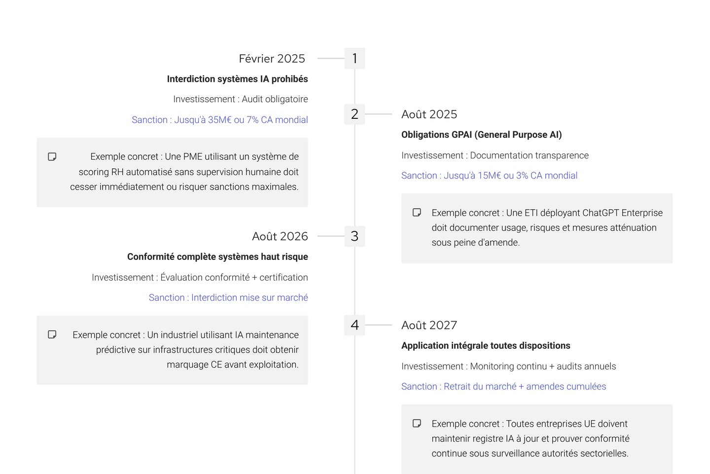Exemple concret: Une PME industrielle utilise IA prédictive sur chaînes production. Résultat assessment : Score 38/100, statut "Non conforme". Actions urgentes : Réaliser analyse d'impact droits fondamentaux (Article 27), documenter architecture technique, mettre en place monitoring continu performance.
