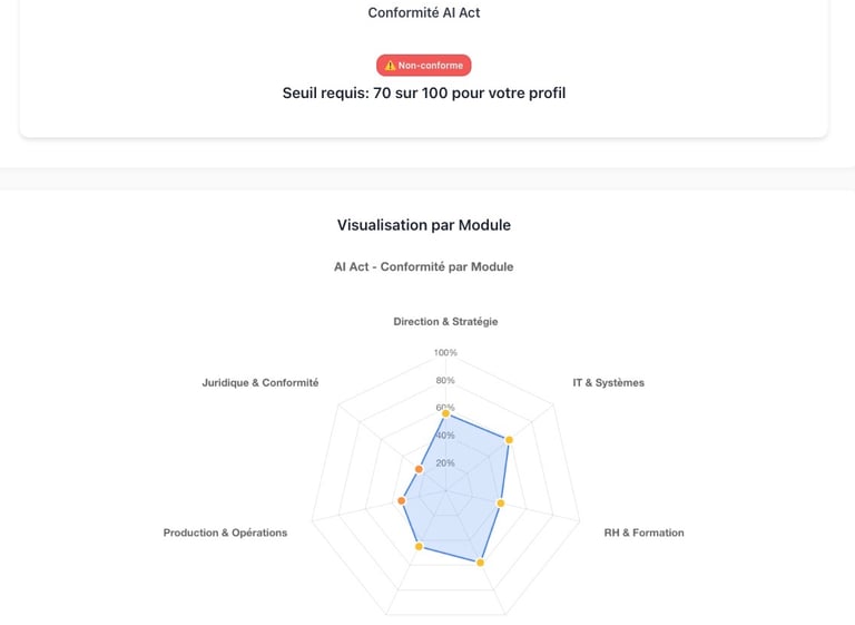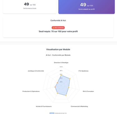 Notre assessment est l'unique solution conçue pour évaluer précisément votre conformité au règlement européen IA Act, adaptée à votre secteur, taille d'entreprise et systèmes IA déployés. Grâce à une méthodologie basée sur les standards officiels UE (Annexe III, CNIL, NIST) et l'analyse de 7 modules métier, il offre un diagnostic exhaustif et des recommandations actionnables pour une mise en conformité structurée.