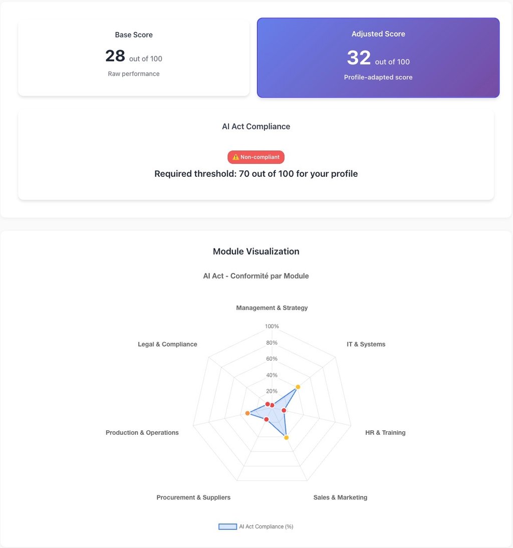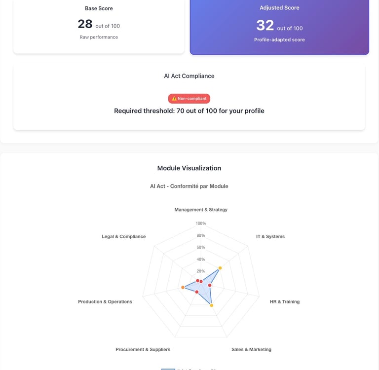 Concrete example: An industrial SME uses predictive AI on production lines. Assessment result: Score 38/100, "Non-compliant" status. Urgent actions: Conduct fundamental rights impact analysis (Article 27), document technical architecture, implement continuous performance monitoring.