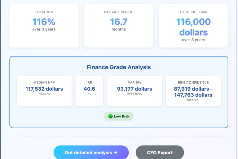To capture the uncertainty inherent in AI projects, leading organizations use Monte Carlo simulations with at least 1,000 iterations. This statistical approach generates a distribution of possible outcomes rather than a single value.
